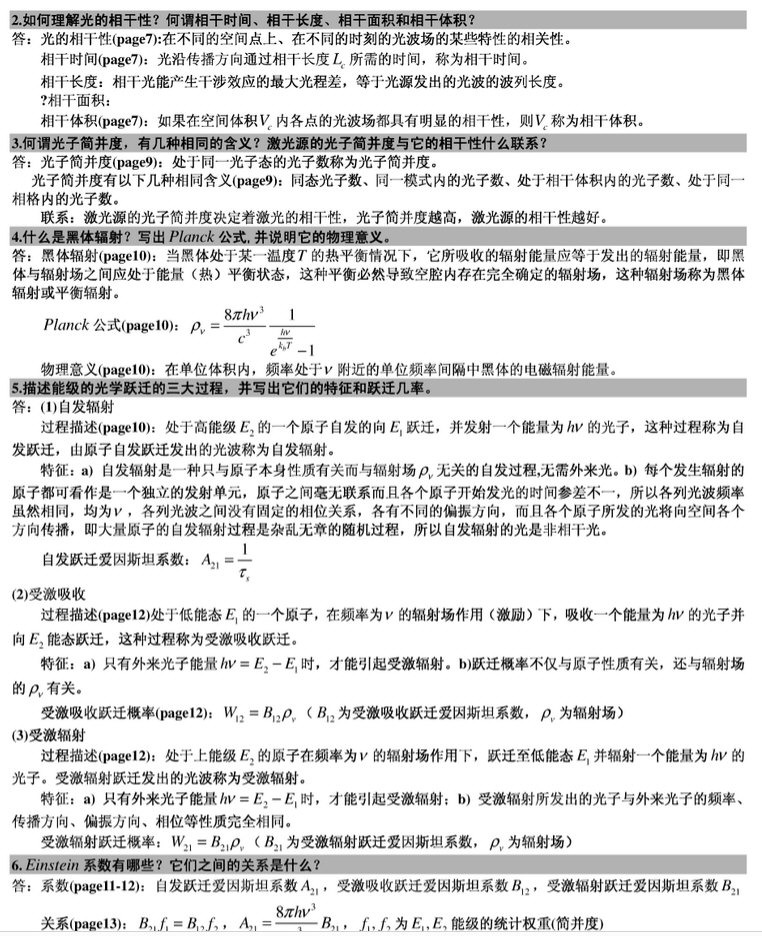 2015华中科技大学光学工程激光原理900真题回忆 一、简答题 1、△n 大于0,激光器是否能够产生自激振荡? 2、光学谐振腔的结构和作用 3、共焦腔与一般腔的等价性 4、均匀加宽与非均匀加宽的特点 5、连续激光器从开始振荡到产生稳定输出增益系数的变化情况 6、光学模式以及横模和纵模 二、三能级四能级的本质区别,以及 ...专业课考研资料 本站小编 免费考研网 2015-12-17内蒙古大学激光原理与技术课后题
