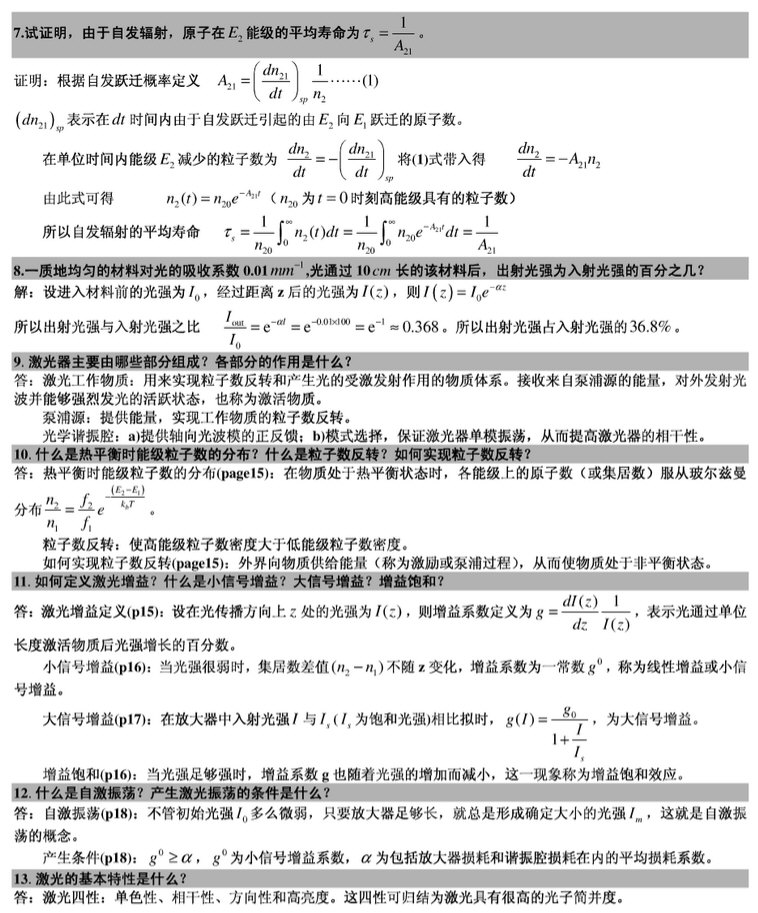 2015华中科技大学光学工程激光原理900真题回忆 一、简答题 1、△n 大于0,激光器是否能够产生自激振荡? 2、光学谐振腔的结构和作用 3、共焦腔与一般腔的等价性 4、均匀加宽与非均匀加宽的特点 5、连续激光器从开始振荡到产生稳定输出增益系数的变化情况 6、光学模式以及横模和纵模 二、三能级四能级的本质区别,以及 ...专业课考研资料 本站小编 免费考研网 2015-12-17内蒙古大学激光原理与技术课后题