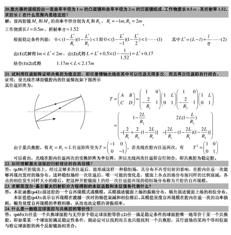 2015华中科技大学光学工程激光原理900真题回忆 一、简答题 1、△n 大于0,激光器是否能够产生自激振荡? 2、光学谐振腔的结构和作用 3、共焦腔与一般腔的等价性 4、均匀加宽与非均匀加宽的特点 5、连续激光器从开始振荡到产生稳定输出增益系数的变化情况 6、光学模式以及横模和纵模 二、三能级四能级的本质区别,以及 ...专业课考研资料 本站小编 免费考研网 2015-12-17内蒙古大学激光原理与技术课后题
