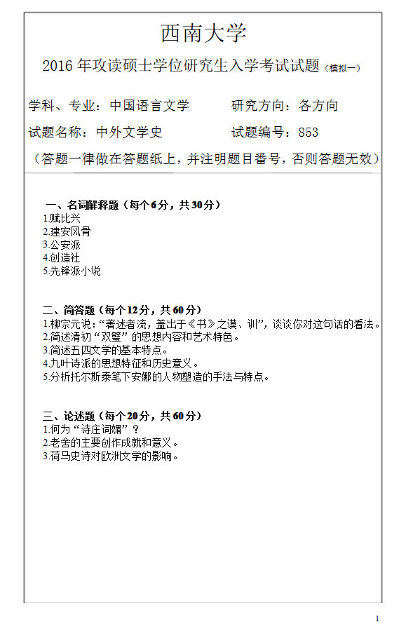 中外文学史19982011年真题 1998年研究生入学考试 专业:文艺学 现当代文学 古代文学 民间文学 科目:中外文学史 一、填空(40分) 1. 现存最早的《诗经》法是毛传郑笺,郑指的是_______________。 2. 屈原的作品有《离骚》、《九歌》、《天问》、_______________《招魂》 ...专业课考研资料 本站小编 免费考研网 2016-03-13