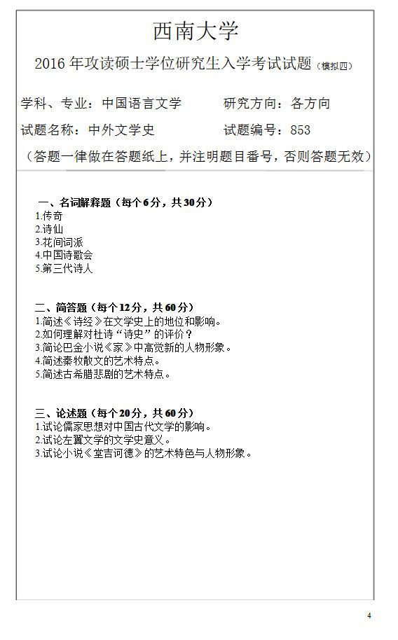 中外文学史19982011年真题 1998年研究生入学考试 专业:文艺学 现当代文学 古代文学 民间文学 科目:中外文学史 一、填空(40分) 1. 现存最早的《诗经》法是毛传郑笺,郑指的是_______________。 2. 屈原的作品有《离骚》、《九歌》、《天问》、_______________《招魂》 ...专业课考研资料 本站小编 免费考研网 2016-03-13