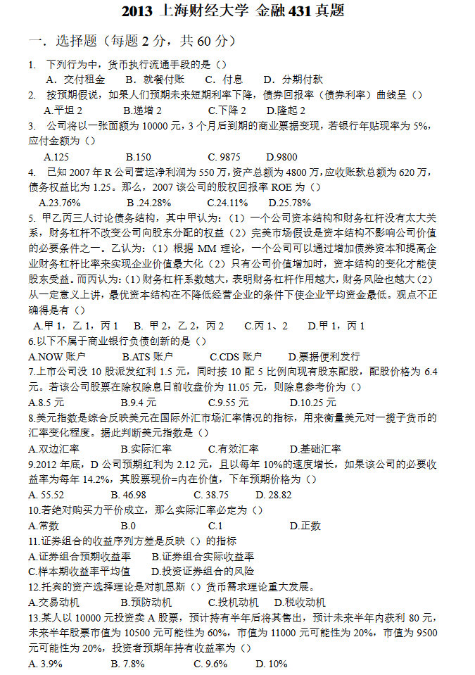 2013年重庆大学431金融学综合考研真题 金融学部分(90分) 一、单项选择题(每题1.5分,共30分) 1. 下列说法哪项不属于法定货币的特征?( ) A. 可以是纸币 B. 代表实质货币或货物 C. 发行者没有将其兑现为实物的义务 D. 货币本身并无内在价值 2. 下列关于货币无限法偿说法不正确的是( )。 ...