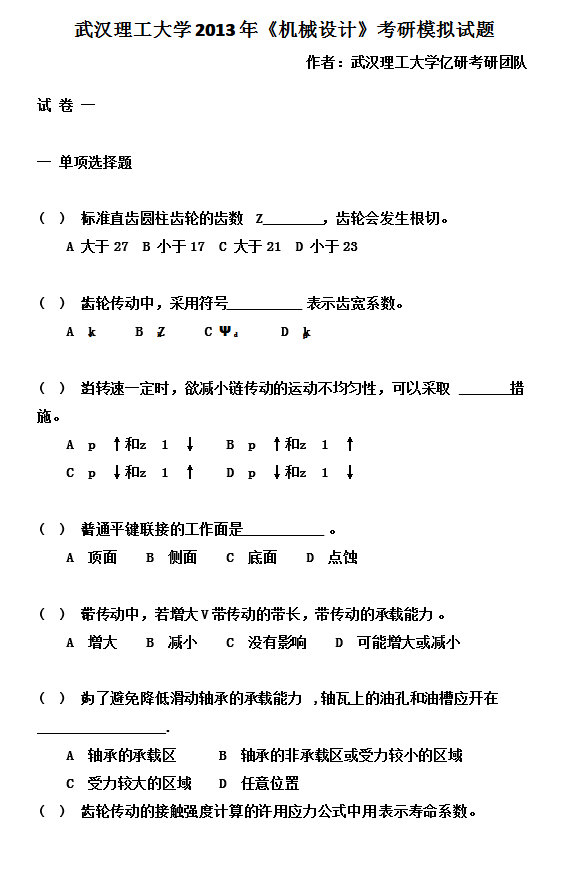 武汉理工大学2013年机械设计考研模拟试题
