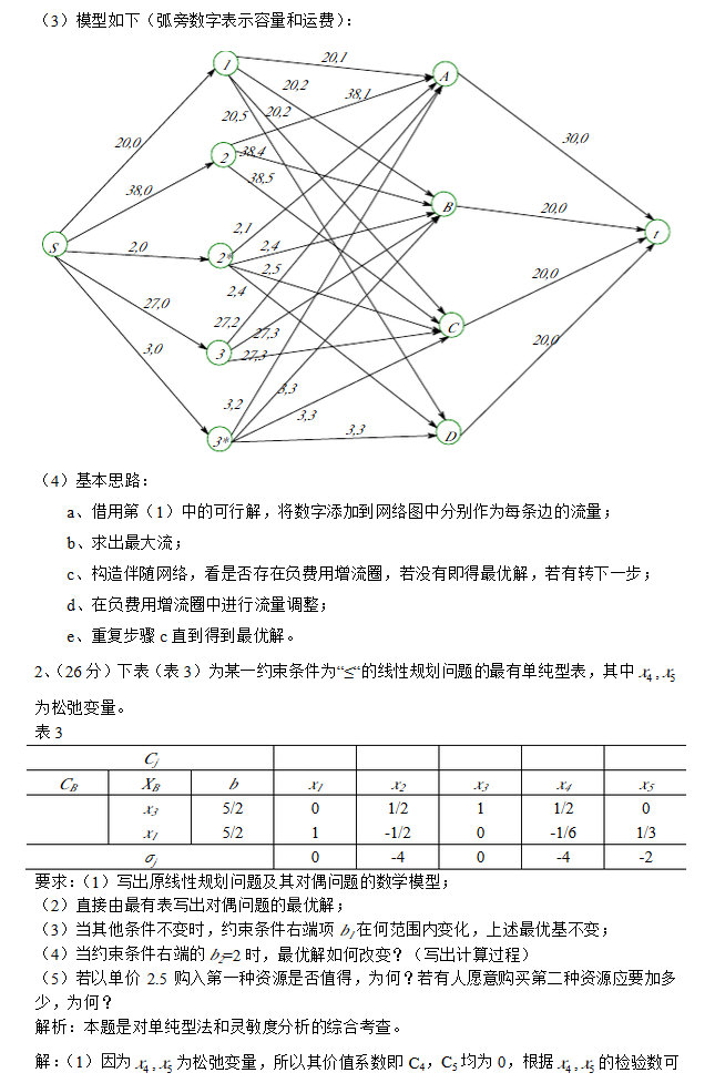 2015年北京交通大学管理运筹学考研真题 一单纯形法求解,并且利用灵敏度分析计算,共计35分。 二运输问题,先列运输模型,再化为对偶问题的模型,之后再求解,还有一个小题是改了某个运价,问是否影响结果?可能是20分 三指派问题,非标准型的,大概是由四个任务,三个人,有两个人可以分别完成两个任务,第一题是化为标 ...专业课考研资料 本站小编 网络资源 2015-07-13北理工管理运筹学考研全年复习计划