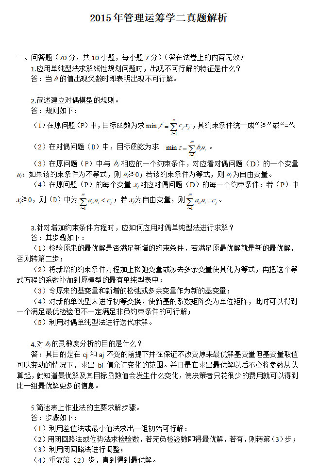 2015年北京交通大学管理运筹学考研真题 一单纯形法求解,并且利用灵敏度分析计算,共计35分。 二运输问题,先列运输模型,再化为对偶问题的模型,之后再求解,还有一个小题是改了某个运价,问是否影响结果?可能是20分 三指派问题,非标准型的,大概是由四个任务,三个人,有两个人可以分别完成两个任务,第一题是化为标 ...专业课考研资料 本站小编 网络资源 2015-07-13北理工管理运筹学考研全年复习计划