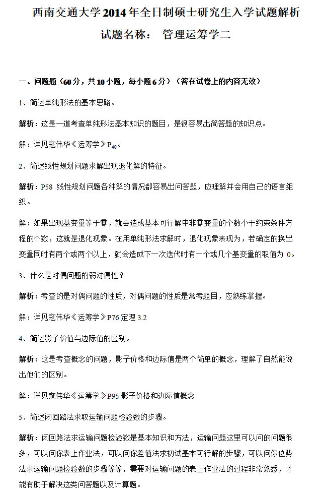 专业课考研资料 本站小编 福瑞考研网 2016-12-28西南交通大学2015年929管理运筹学一考研真题答案解析