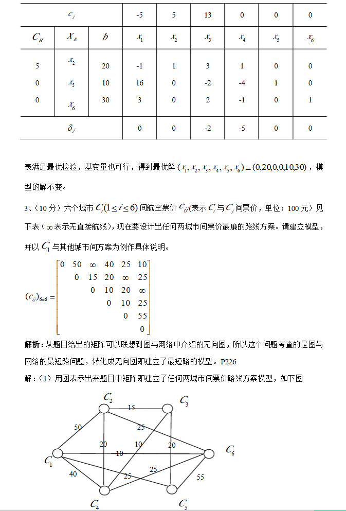 2015年北京交通大学管理运筹学考研真题 一单纯形法求解,并且利用灵敏度分析计算,共计35分。 二运输问题,先列运输模型,再化为对偶问题的模型,之后再求解,还有一个小题是改了某个运价,问是否影响结果?可能是20分 三指派问题,非标准型的,大概是由四个任务,三个人,有两个人可以分别完成两个任务,第一题是化为标 ...专业课考研资料 本站小编 网络资源 2015-07-13北理工管理运筹学考研全年复习计划