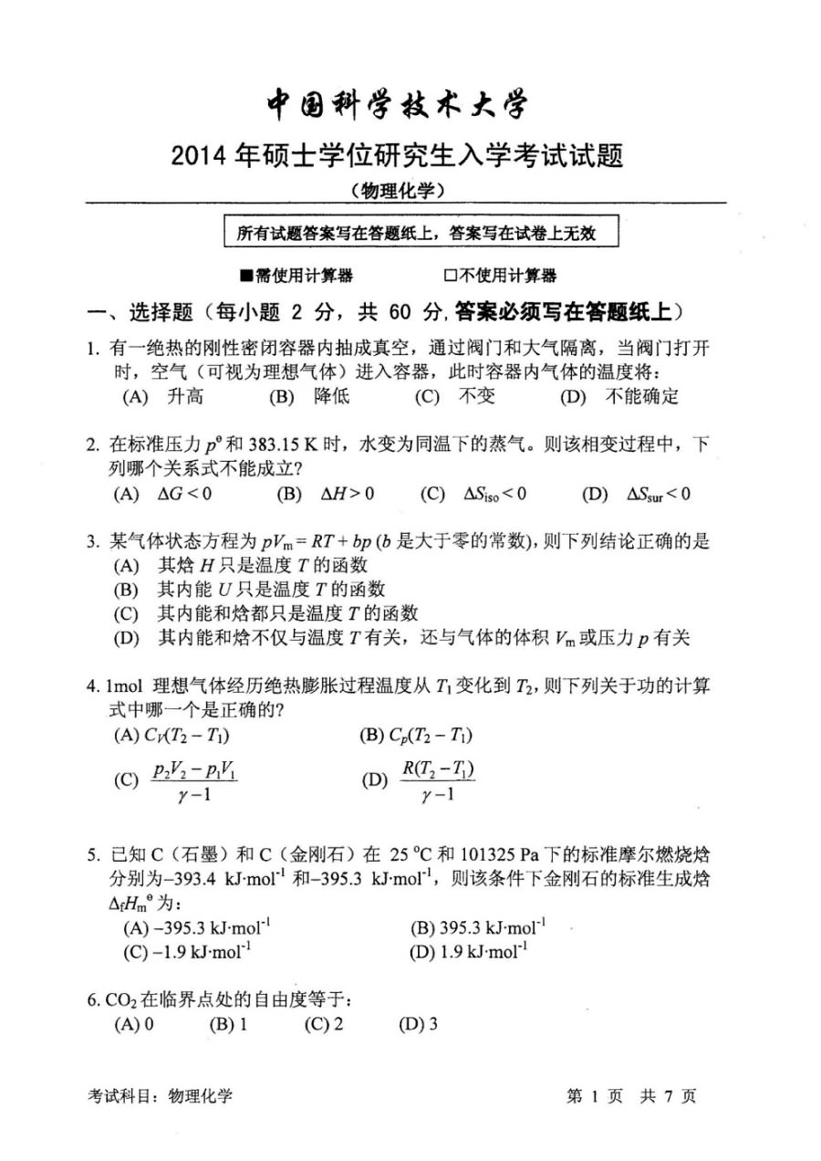 中国科学技术大学2010-2016年物理化学考研真题试题及参考答案与解析(25)