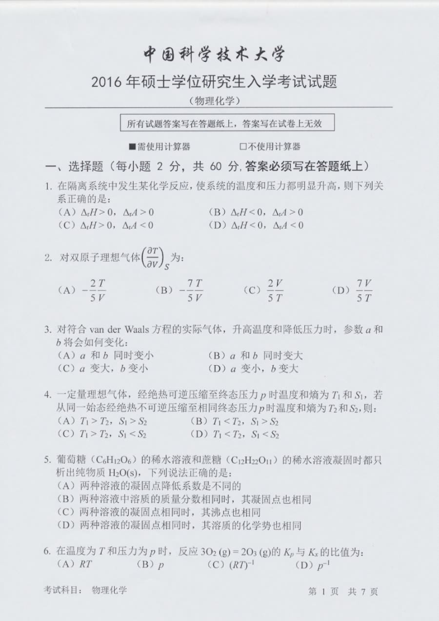 中国科学技术大学2010-2016年物理化学考研真题试题及参考答案与解析(39)