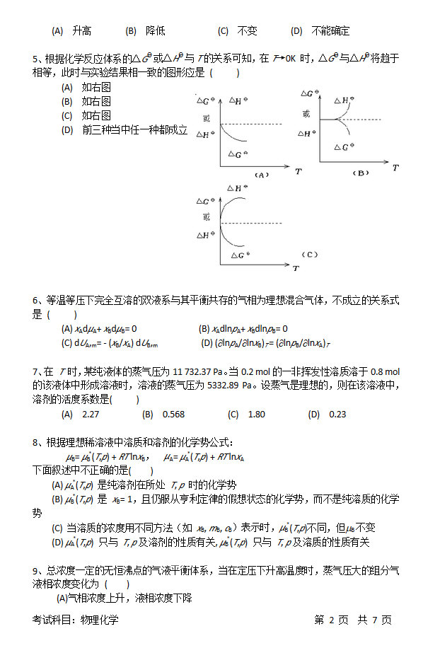 中国科学技术大学2017年模拟考试物理化学考研试题(2)