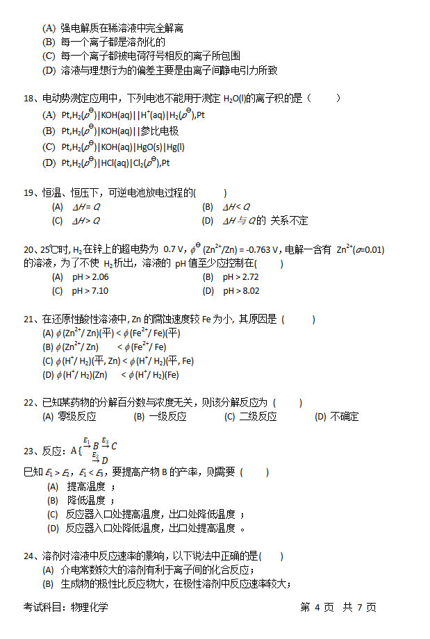 中国科学技术大学2017年模拟考试物理化学考研试题(4)