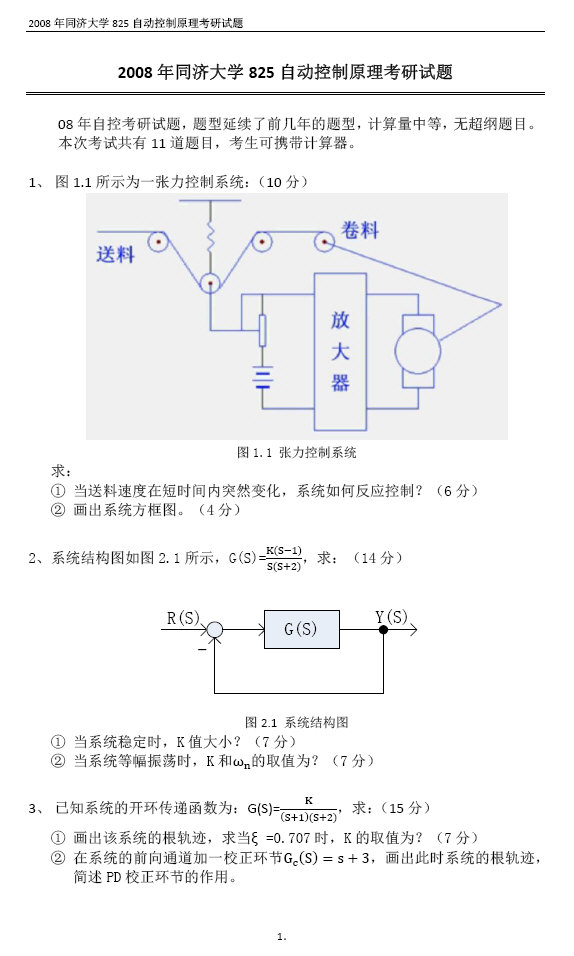 一:关于液位控制的,有浮子,阀门,电动机,减速器,让画出结构图,再分析是什么类型的系统。。。。貌似经常见得题目。