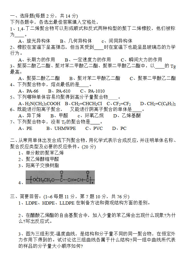 一、写出合成下列聚合物的反应式:(4分)1.聚酰胺662.聚乙烯酵缩甲醛3.聚氯乙烯 二、根据聚台物的结构,简要说明下列问题(选答4题)(36分)1.聚乙酸乙烯酯(PVA c)与聚乙烯醇(PVA)的结晶性差异2.聚四氟乙烯的耐溶剂性3.全同立构PP加热熔融后不能变成无规立构PP4.LDPE与HDPE的密度差异5.SBS是热塑性弹性体 三、两种单体进行共聚 ...