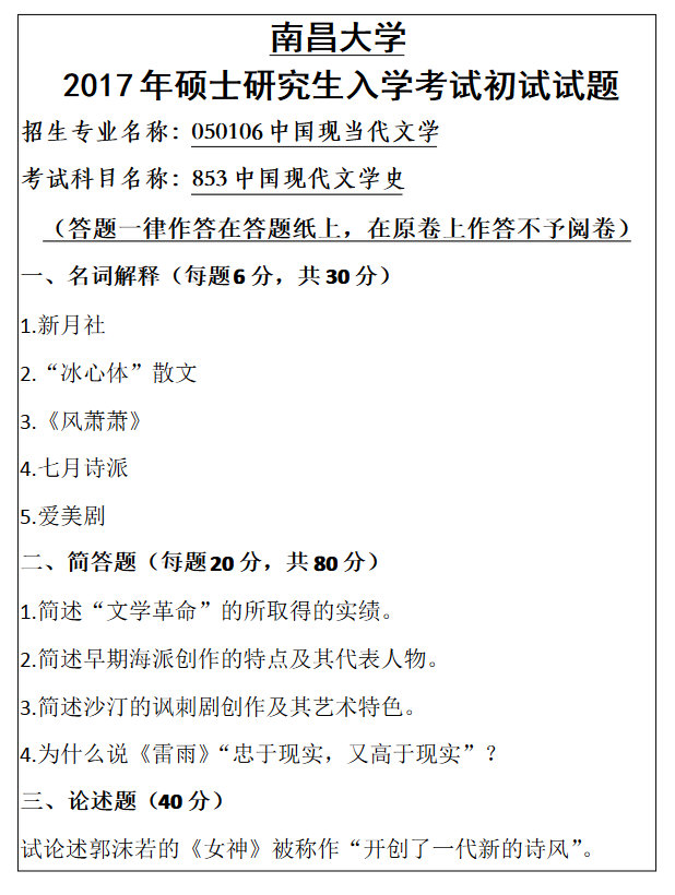 南昌大学853中国现代文学史历年考研真题汇编(8)