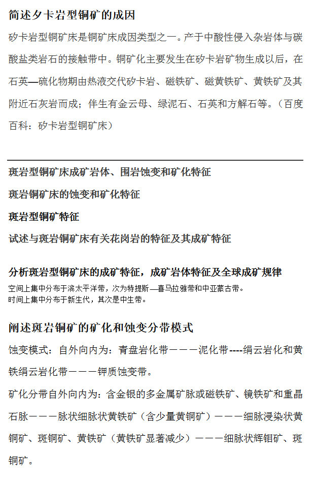 2000年南京大学824矿床学考研试题 以下试题任选5题,每题20分1、 简述矽卡岩型矿床的特征及成矿机制2、 阐述硫物化矿床次生富集带的形成机制3、 阐述块状硫化物矿床的主要特征和形成机制,不同类型块状硫化物矿床的成矿地质背景和含矿岩系特征4、 阐述高温、低温、中温热液矿床在矿物组合和围岩蚀变等方面的差异5、 阐述生物 ...