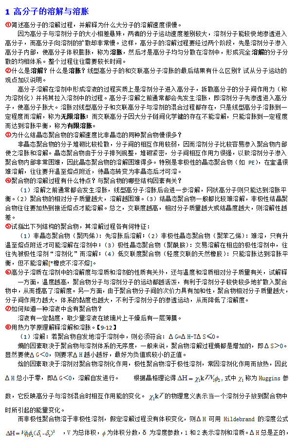 一、 聚合物的相对分子质量1 聚合物相对分子质量的统计意义1.1 利用定义式计算相对分子质量①写出对分散性聚合物几种统计平均分子量和多分散系数的各种表达式。数均相对分子质量: 式中,n为物质的量,x为摩尔分数 式中,m为质量,为质量分数重均相对分子质量: Z均相对分子质量: 黏均 ...