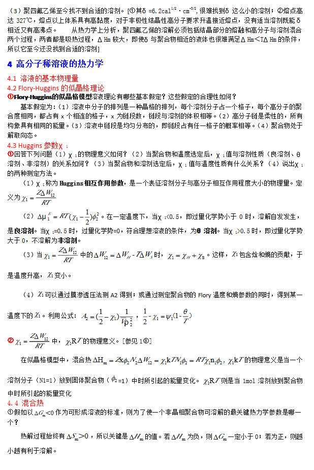 一、 聚合物的相对分子质量1 聚合物相对分子质量的统计意义1.1 利用定义式计算相对分子质量①写出对分散性聚合物几种统计平均分子量和多分散系数的各种表达式。数均相对分子质量: 式中,n为物质的量,x为摩尔分数 式中,m为质量,为质量分数重均相对分子质量: Z均相对分子质量: 黏均 ...
