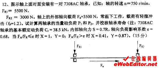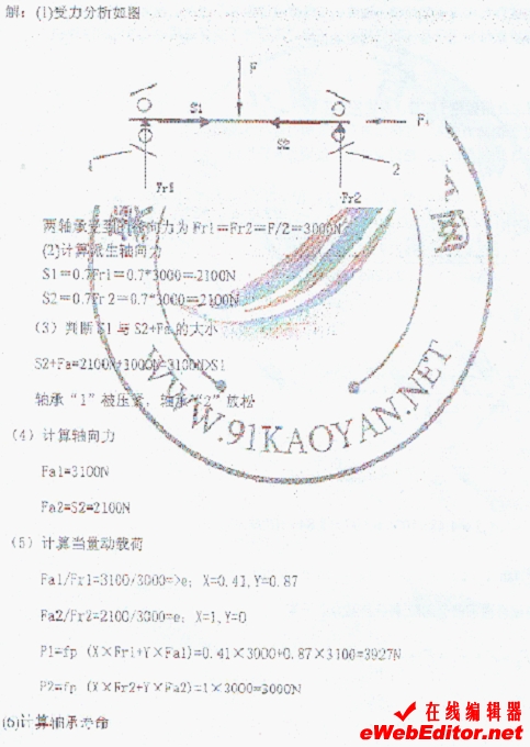 【分析】该题主要考察轴承的计算,主要为轴承的载荷计算,公式都应该确定,题目的解题思路也很清晰,主要注意公式的记忆和单位的换算。题目区别于之前几年的地方在于要先计算FR1和FR2,另外之前几年都要求计算轴承寿命,这部分也要掌握。