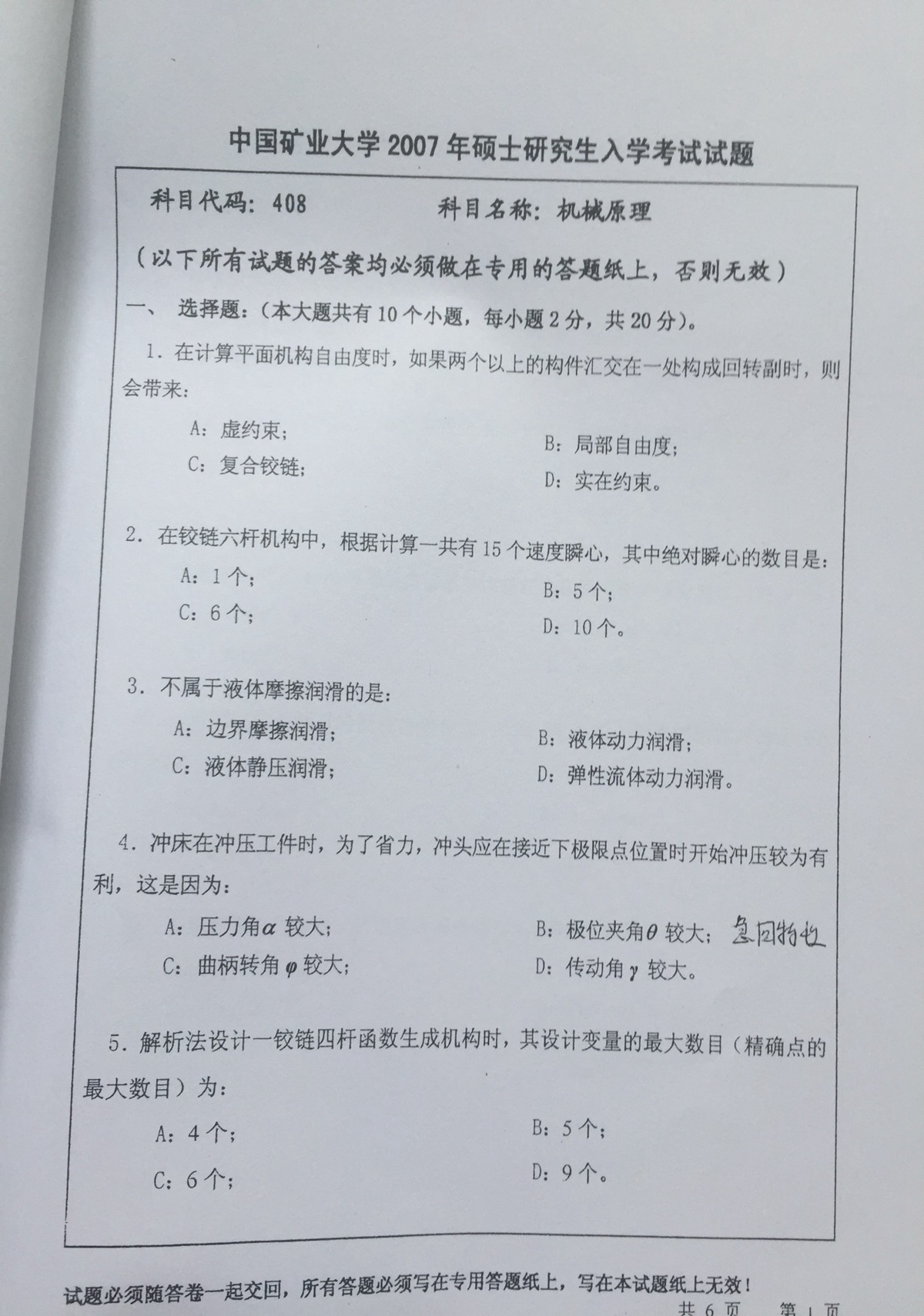中国矿业大学2003-2007机械原理考研真题(23)