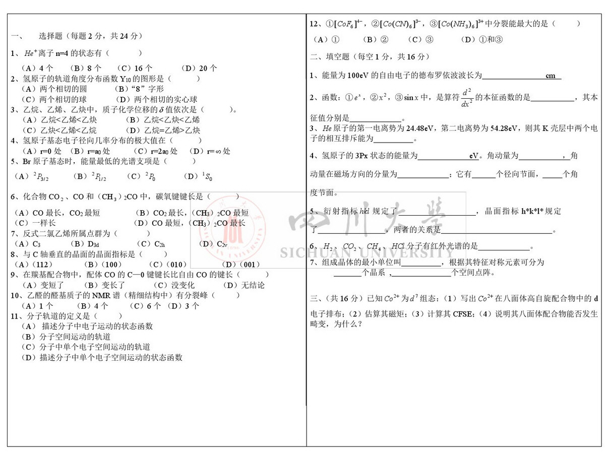 四川大学结构化学考研复习题一及答案