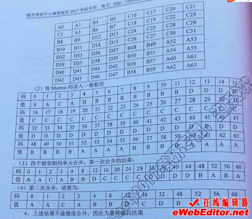 4、在栅格数据存储时一般GIS软件包中会有一个头文件表示该栅格数据的相关信息,问头文件的内容主要有哪些?怎样才能确定某一个行列的位置?假如有如下栅格数据,请按照十进制Morton码编码方式对该数据进行编码压缩并写出编码结果。