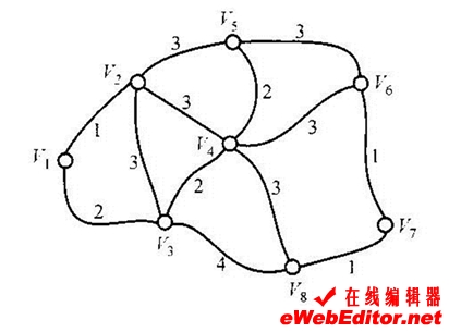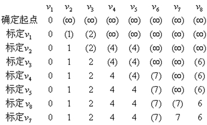 (2)对未被定标的结点全部给出暂时标号,其值为min[ j的旧标号,(i的标号+wij)],这里i是前一步刚被标定的结点,wij是边eij的权,如果结点i和j不相邻接,wij=∞。