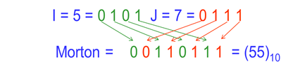例如,某栅格单元的行号 I=5,列号 J=7, Morton码的计算如下图所示: