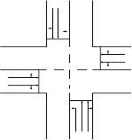 四.某交叉口,东西干道一个方向有2条车道,南北干道一个方向有3条车道,各车道的车流方向如图所示。车种比例为大车:小车=1:1,车头时距为3.26秒。信号灯周期为120秒;绿灯时间,东西向50秒,南北向为65秒。第一辆车起动,通过停车线时间为2.3秒。路口折减系数为0.9。东西方向的左转车与右转车各占该进口交通量的15%,南北方向的左转车和右转车分别占该进口交通量的20%和10%,左转车影响系数为0.925。设该交叉口不影响对向直行车的左转交通量为109辆/h,直右车道上允许右转交通量为150辆/h。请按停车线法计算该交叉口的设计通行能力。