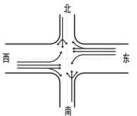 3. 已知某交叉口(如右图),东西干道一个方向有三个车道,南北支路一个方向有一条车道。受车流不均匀性及非机动车、行人干扰的折减系数为0.9。信号灯管制交通配时:周期T=120S,绿灯tg=52S,绿灯亮后,第一辆车启动,通过停车线的时间为2.3S。车种比例大车:小车为2:8,车辆平均通过停车线的时间为2.65S。东西方向左转车占该进口交通量的15%,右转车占进口交通量的10%;南北向左转、右转各占该进口交通量的15%。求该交叉口的设计通行能力。
