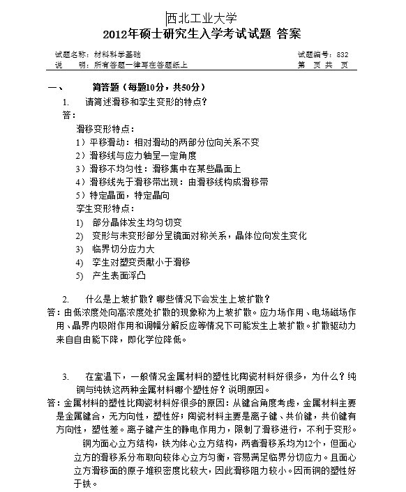 西北工业大学2005-2012材料科学基础考研真题带详细答案 36页