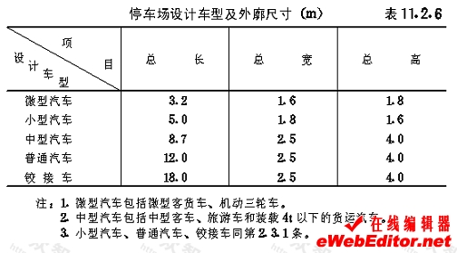 第11.2.6条 停车场采用的设计车型及外廓尺寸见表11.2.6。设计时应以停车场停车高峰时所占比重大的车型为设计车型。如有特殊车型,应以实际外廓尺寸作为设计依据。