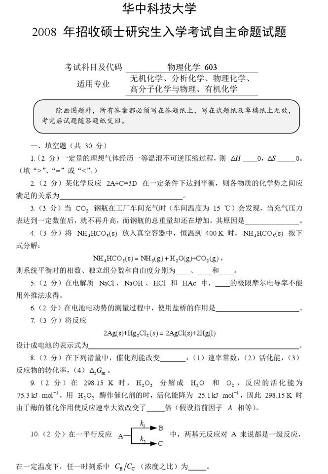 华中科技大学2008年物理化学(603)考研真题
