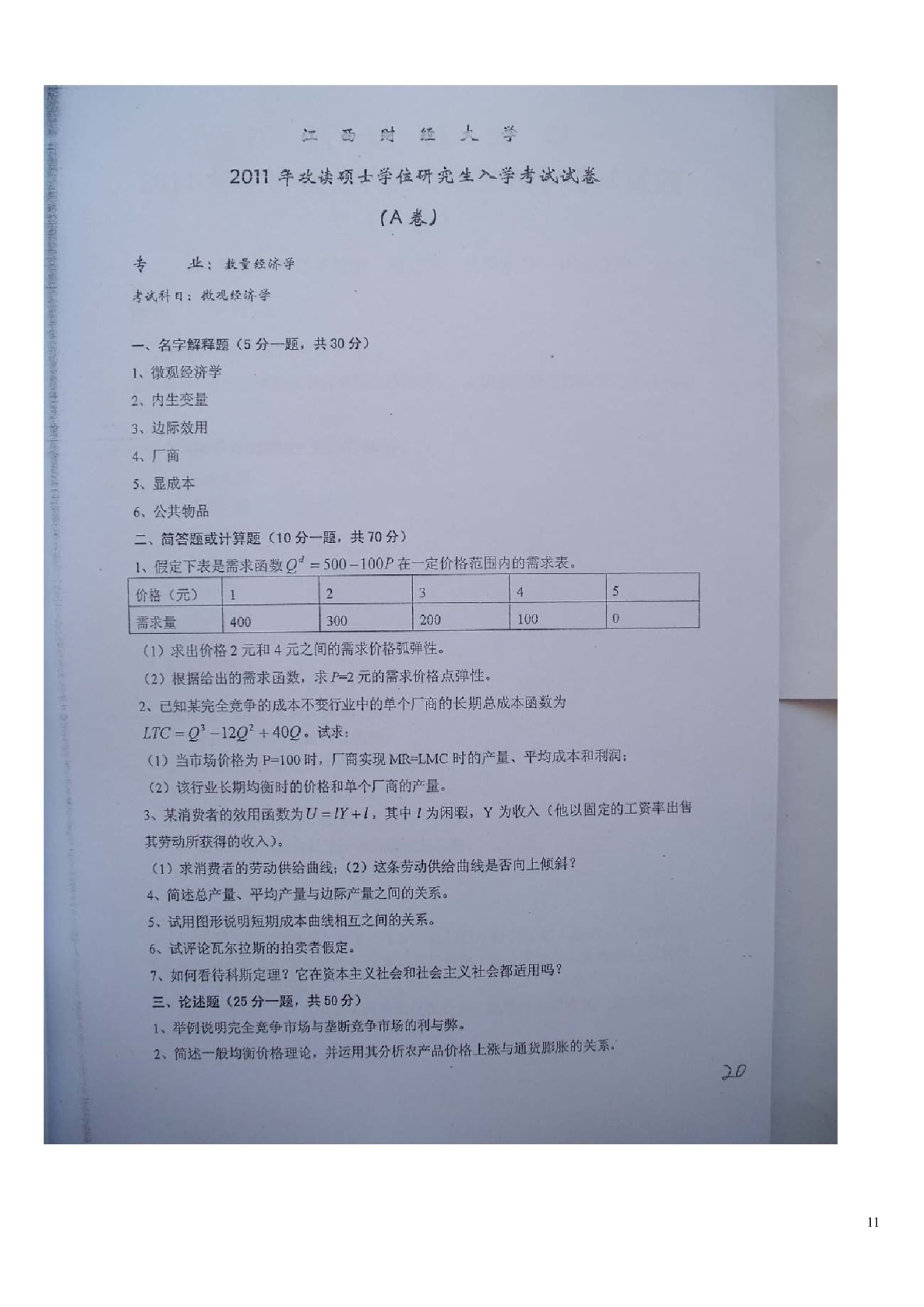 江西财经大学2015-2005微观经济学(数量经济学专业)考研真题(11)