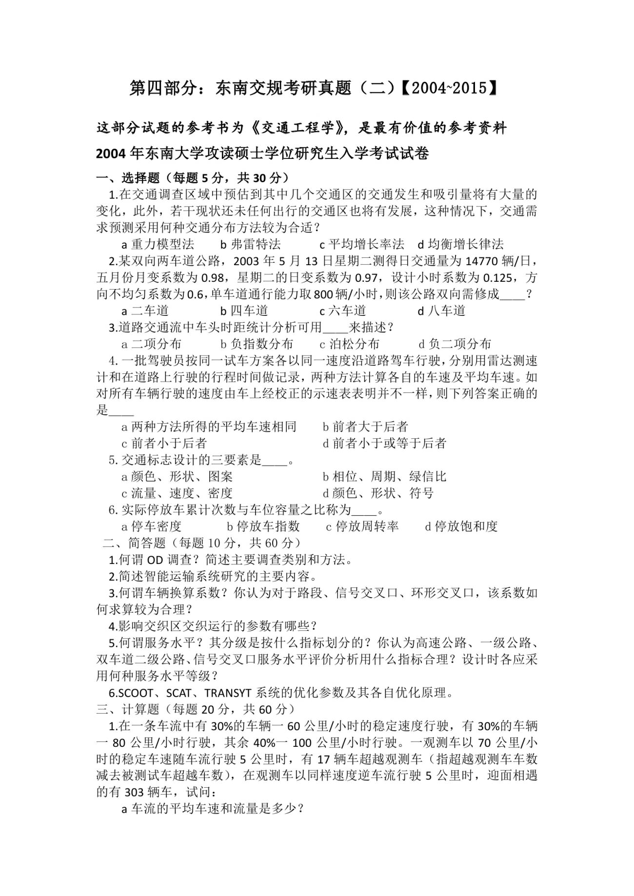 历年攻读硕士学位研究生入学考试试题试题编号:51试题名称:交通工程学基础1992年:一.在一条长度为24公里的干道起点断面上,于6分钟内观测到汽车100辆通过,设车流是均匀连续的且车速V=20公里/小时,试求流量(q)、时距(ht)、空距(hd)、密度(K)以有第一辆汽车通过此干道所需时间(t)[以分钟或小时计均可]。(15分)二.某路段 ...
