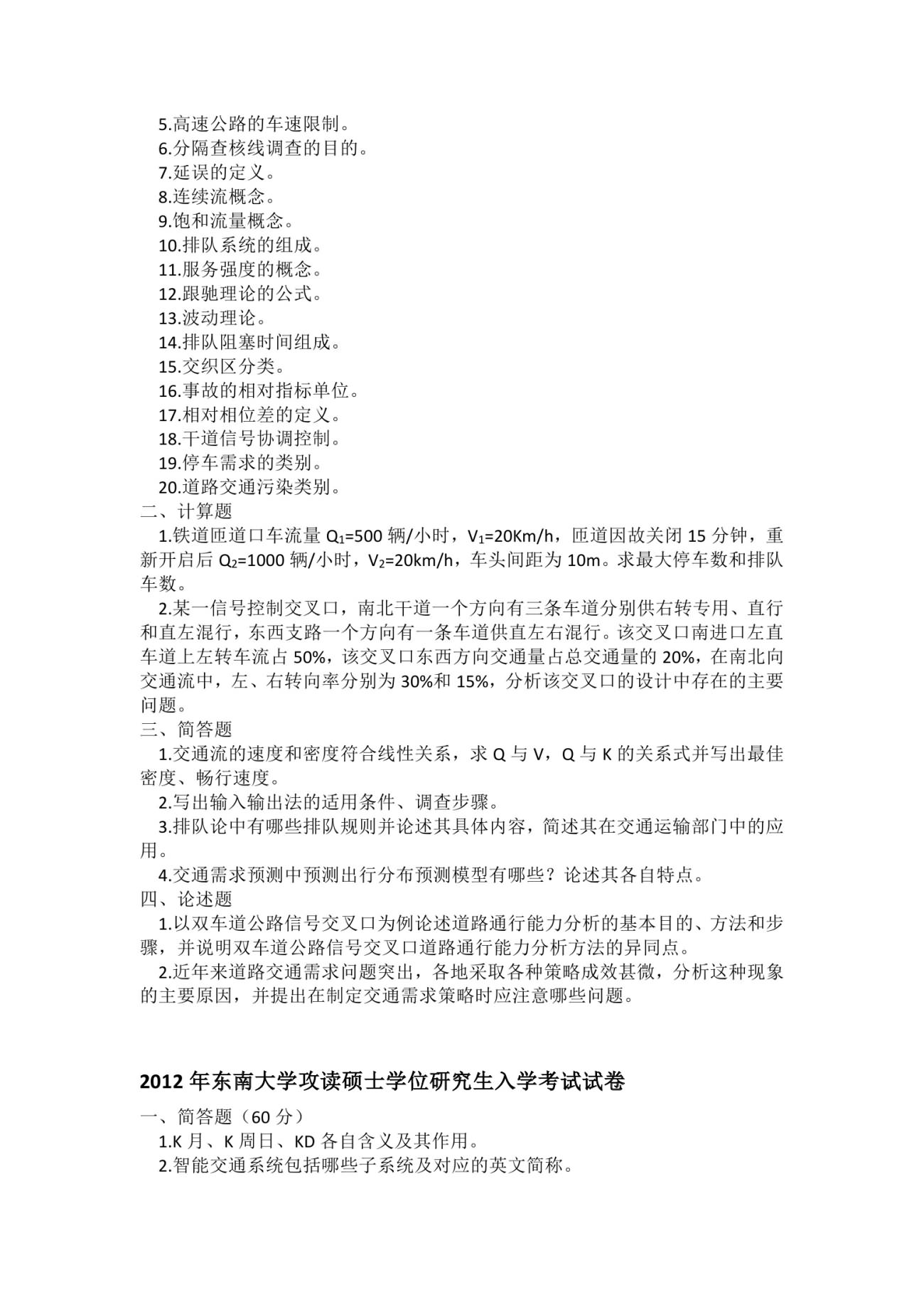 历年攻读硕士学位研究生入学考试试题试题编号:51试题名称:交通工程学基础1992年:一.在一条长度为24公里的干道起点断面上,于6分钟内观测到汽车100辆通过,设车流是均匀连续的且车速V=20公里/小时,试求流量(q)、时距(ht)、空距(hd)、密度(K)以有第一辆汽车通过此干道所需时间(t)[以分钟或小时计均可]。(15分)二.某路段 ...