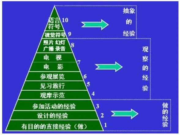 释义:戴尔认为,人们学习时,由直接到间接,由抽象到具体获得学习比较容易。他用一个学习经验的三角形宝塔型图来表示不同学习的学习效果,人们常称为“经验之塔”