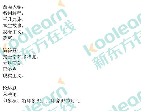 636-中外美术史一、考试目的本考试旨在全面考察考生对《中外美术史》的基本概念、基础知识、基本理论的掌握程度及运用能力。二、考试要求测试考生对于中国美术史、外国美术史、绘画理论、美术史学的基本知识、基础理论和基本方法的掌握情况和运用能力。在这四个方向中以中国绘画史和外国绘 ...专业课大纲 本站小编 免费考研网 2018-01-02西南大学2018年硕士研究生学费政策
