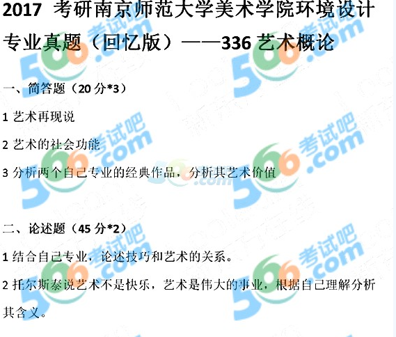 2017艺术学考研真题(福州大学设计学专业艺术概论) ...专业课考研资料 本站小编 免费考研网 2018-01-032017艺术学考研真题(南京师范大学—环境设计)