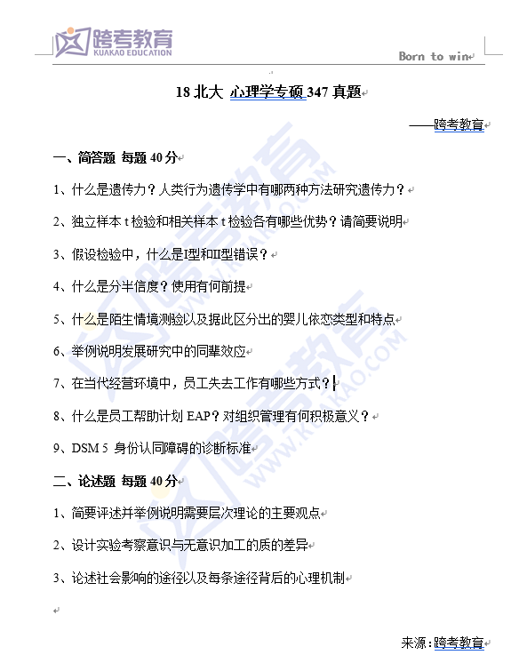 2018年北京大学347心理学专硕考研真题(回忆版)