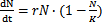 对于真实的自然种群来说,资源和空间都是有限的,某个资源或空间被某一个体占据以后,就不能被其他个体占据,所以某一特定的环境空间只能容纳一定个体的数量K,称为最大环境容量,当达到K时,种群增长率为0,。对于能容纳K个个体的环境,其占据的资源空间为1/k,则N个个体占据的资源空间为N/K,剩余的资源空间为(1-N/K)。逻辑斯蒂模型就是在简单的指数增长方程上增加一个新项(1-N/K)来代表密度制约。即:
