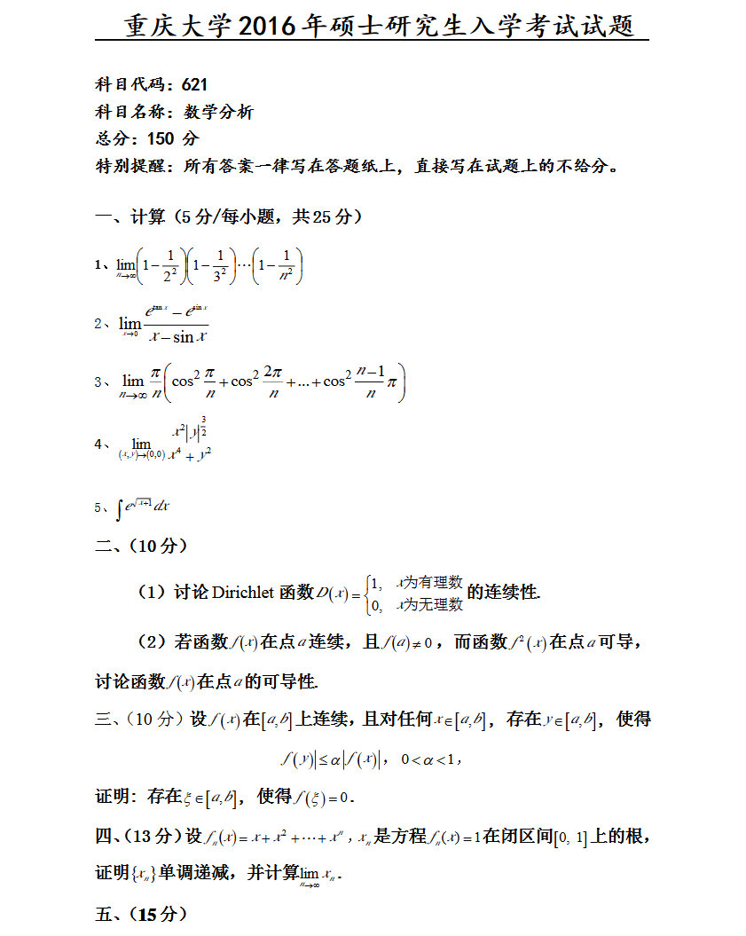 考试科目:611数学分析一、 复习要求:要求学生掌握数学分析课程的基本概念、基本结论与算法,能够运用数学分析的理论求解和证明相关命题。二、主要复习内容:本课程考核内容包括实数的基本理论与极限、单变量微积分学,级数论,多变量微积分学、广义积分五大部分组成.实数的基本理论和极限理论部分包括变量与函数,极 ...