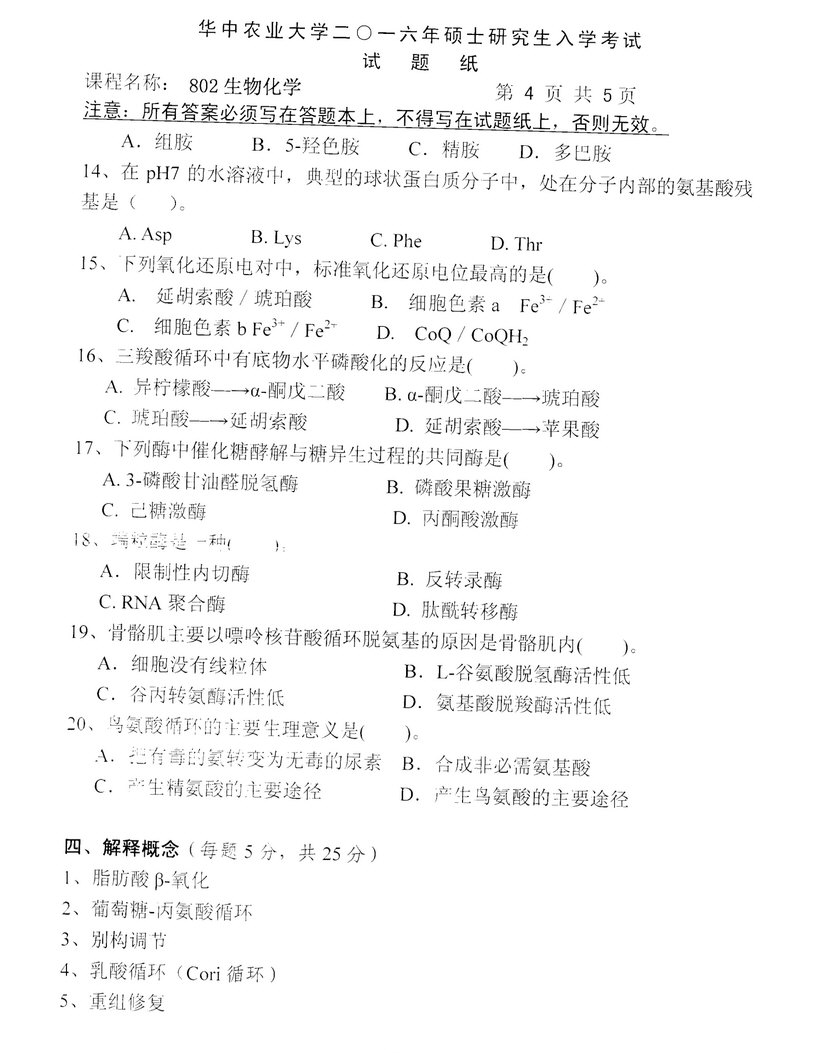 华中农业大学2017年--2016年802生物化学考研真题(9)