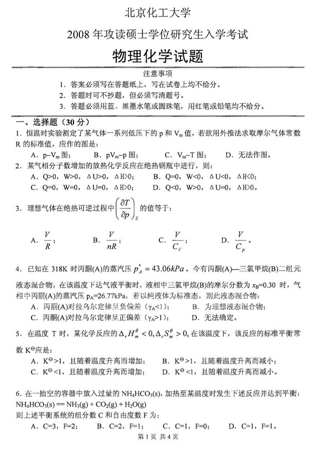 物理化学考试大纲一、物质的pVT关系和热性质1. 流体的pVT状态图、pV图和压缩因子图,气液相变和气液临界现象,饱和蒸气压、沸点和临界参数。 2. 范德华方程及其对气液相变的应用。普遍化范德华方程。pVT关系的普遍化计算方法。对应状态原理。 3. 热力学第一定律。 、 ...