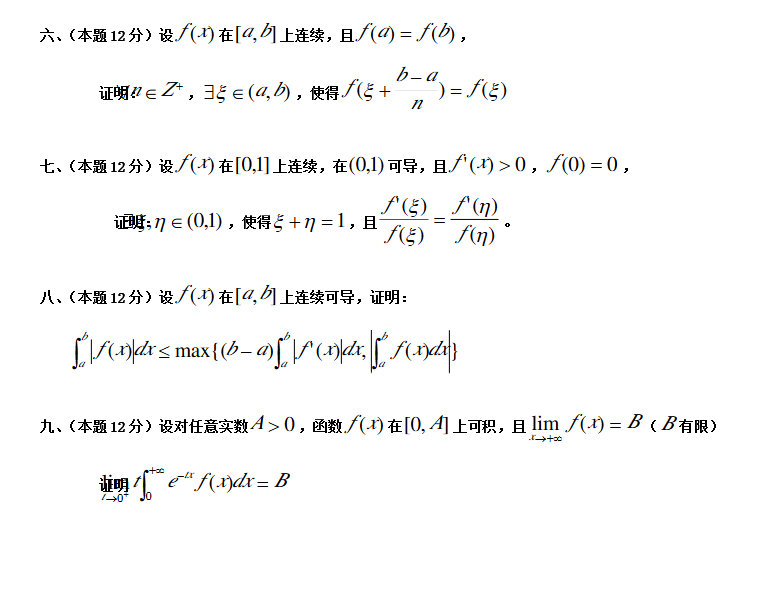 天津工业大学硕士研究生入学考试业务课程大纲课程编号:601 课程名称:数学分析一、考试的总体要求本课程要求学生能正确掌握数学分析的基本概念、基本理论和基本技巧,能为以后从事科学研究和继续学习奠定坚实的基础。二、考试内容:1、极限与连续性(40%)1) 极限的定义及其证明; 2) 函数连续性、一致连续 ...