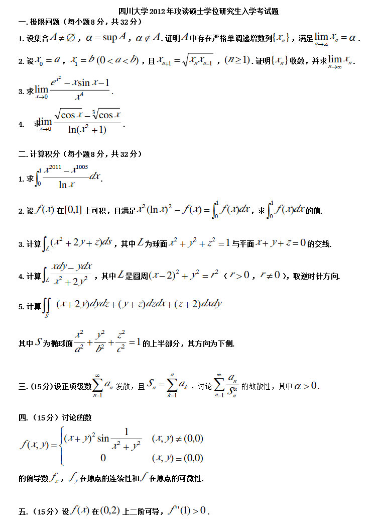 四川大学2000-2012年数学分析考研试题(15)