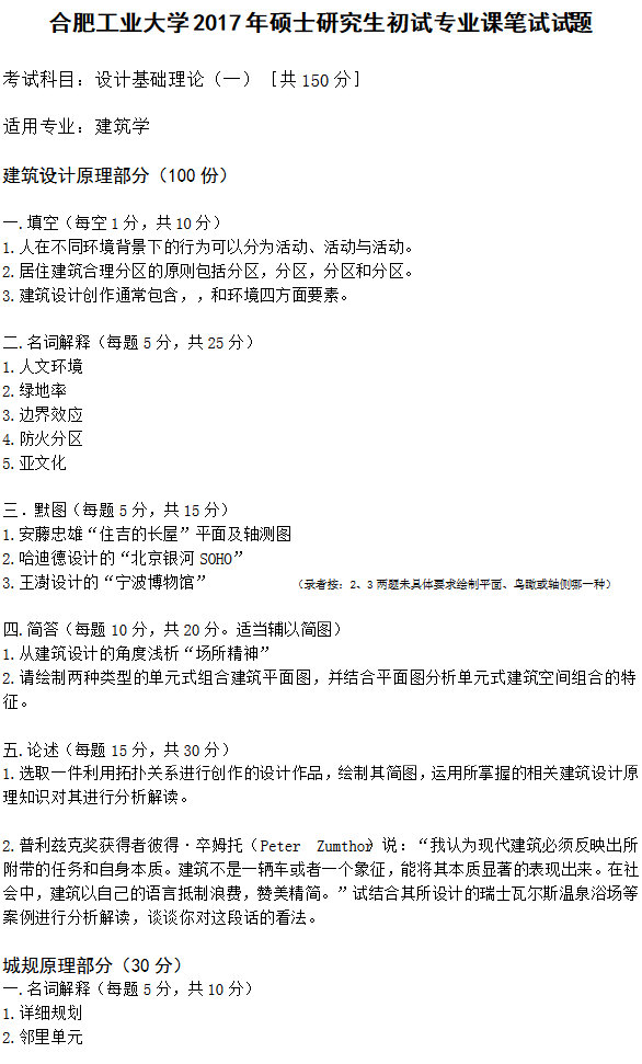合肥工业大学2017年硕士研究生初试专业课笔试试题考试科目:设计基础理论(二)[共150分]适用专业:建筑学建筑设计原理部分(100份)一.填空(每空1分,共10分)1.人在不同环境背景下的行为可以分为活动、活动。2.居住建筑合理分区的原则包括分区,分区,分区和分区。3.建筑设计创作通常包含,,和环境四方面要素。二.名词 ...