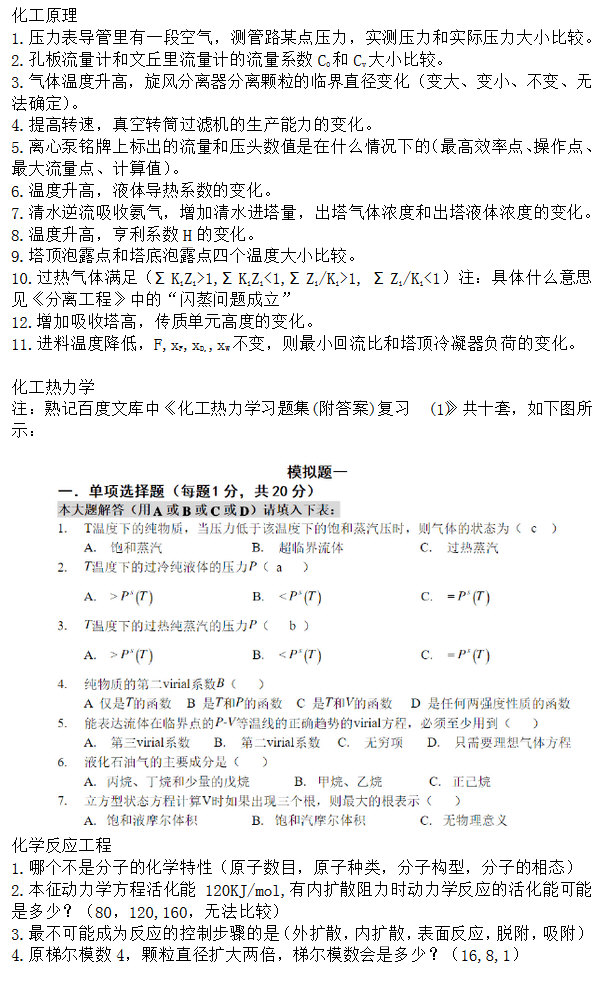 一,17个选择,一个两分考了离心泵阀门开度的影响,吸收增加气液比推动力的变化,对操作设备费的影响,L接近最小塔高~,理想干燥条件,浓度对H影响,对流传热系数变化,恒速干燥速率加快临界含水量的变化,层流湍流区别,二,填空20个一个一分干燥物料水分计算,板式塔分类,表压绝压计算,离心泵三种能量损失,气相传质推 ...