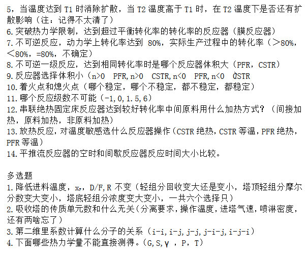 一,17个选择,一个两分考了离心泵阀门开度的影响,吸收增加气液比推动力的变化,对操作设备费的影响,L接近最小塔高~,理想干燥条件,浓度对H影响,对流传热系数变化,恒速干燥速率加快临界含水量的变化,层流湍流区别,二,填空20个一个一分干燥物料水分计算,板式塔分类,表压绝压计算,离心泵三种能量损失,气相传质推 ...