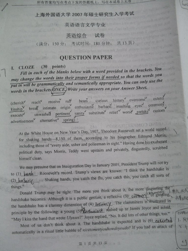 2007上海外国语大学英语语言文学专业英语综合考研真题