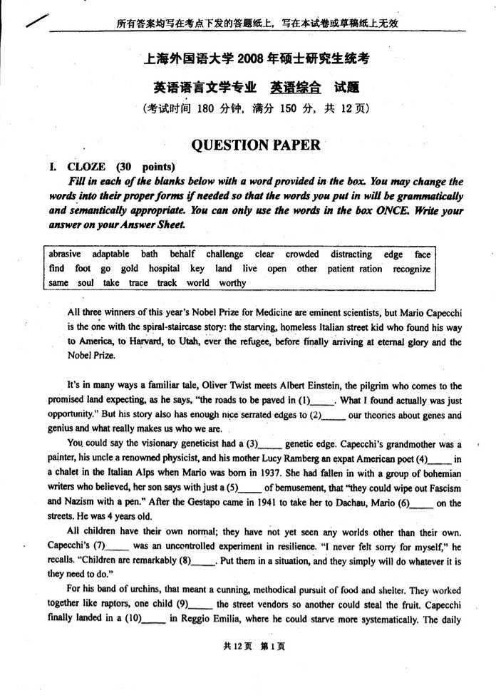 2008上海外国语大学英语语言文学专业英语综合考研真题